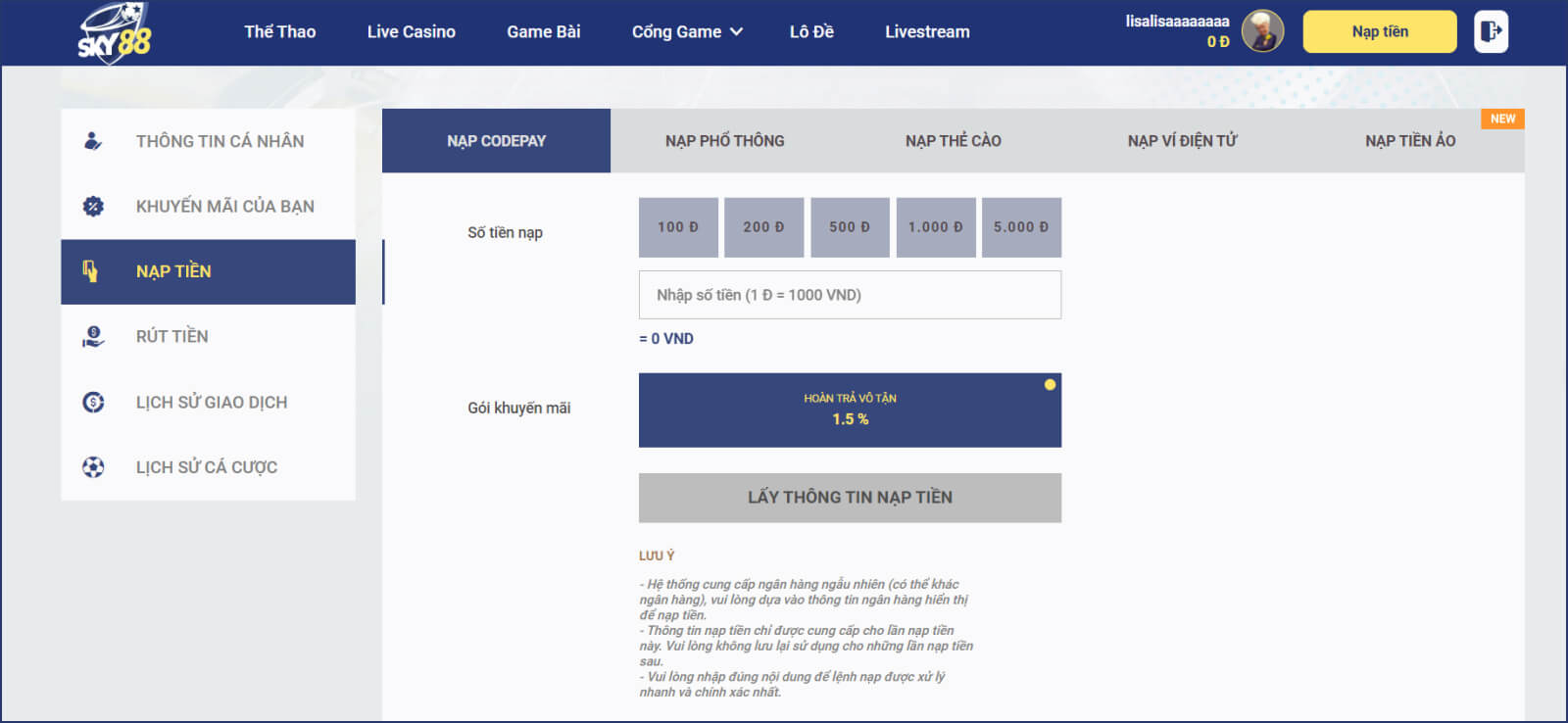 Bước 3. Bấm vào nút LẤY THÔNG TIN NẠP TIỀN